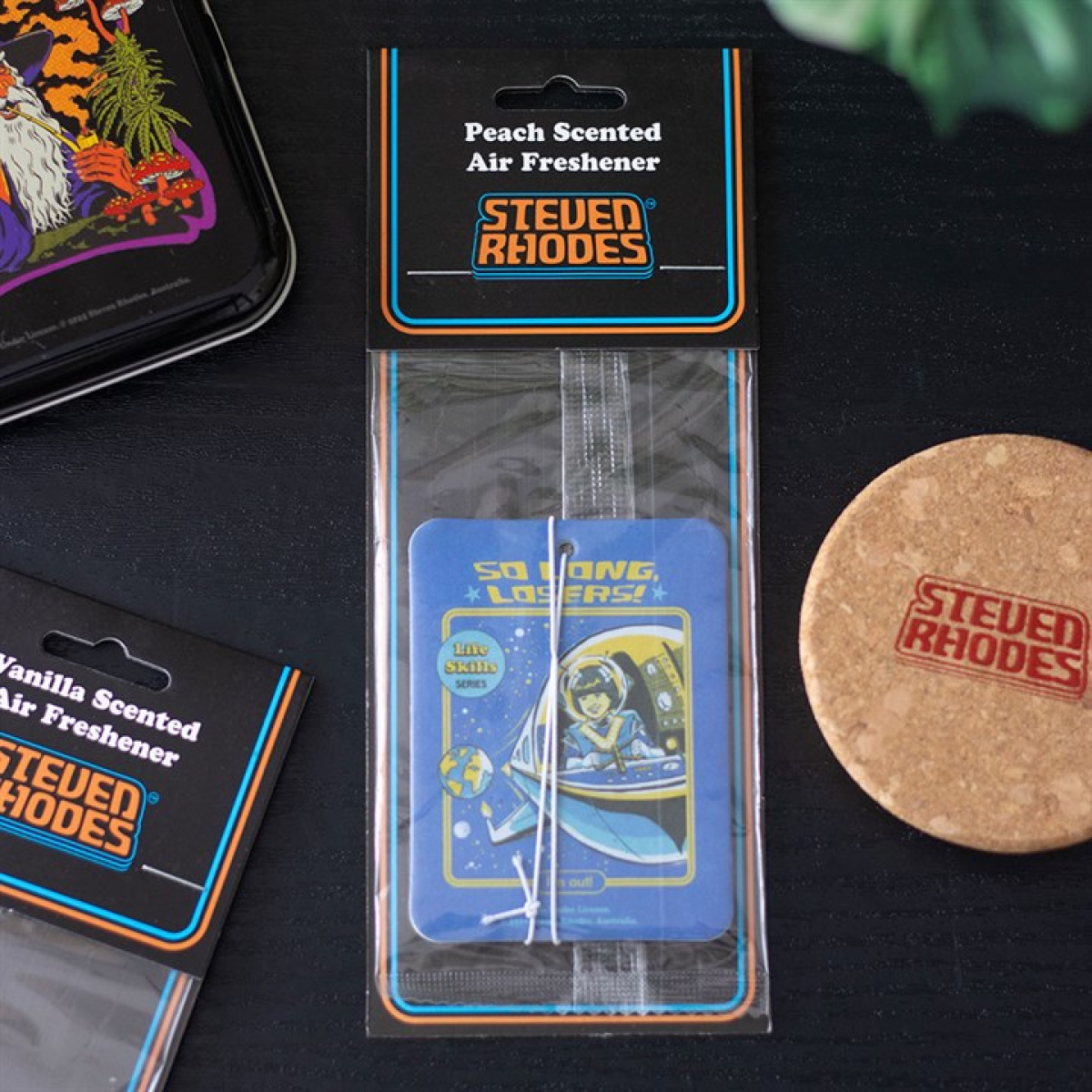 Escape the mundane with a burst of irreverent humour and peachy fragrance. This officially licensed Steven Rhodes air freshener captures the spirit of retro rebellion—perfect for anyone who needs a witty reminder to leave their worries behind. Transform your commute or workspace into a sanctuary of cheeky charm and delightful scent.